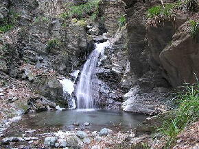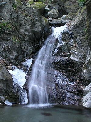 一見、こじんまりとしたかわいい滝ですが、 良く見ると後ろのほうにも小滝が続いています。 落差は10m程との事ですが、合計でという事かな? と思います。時期が真冬のためか、寂しい雰囲気 もありますが、ところどころにある雪や氷がうまい