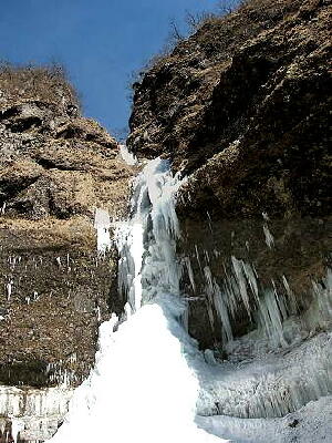 冬になると、80mの落差の滝が 完全に凍りつくことで知られています。 撮影した2007年2月は、暖冬の影響もあって 完全には凍っていませんでした。 それでも、つららが巨大化した氷柱など 通常の生活では味わうことの出来ない 壮大な芸術品を間近で感じられました。 氷の壁を登る、アイスクライマーの方たちも 多く訪れていて、楽しい場所です。 |